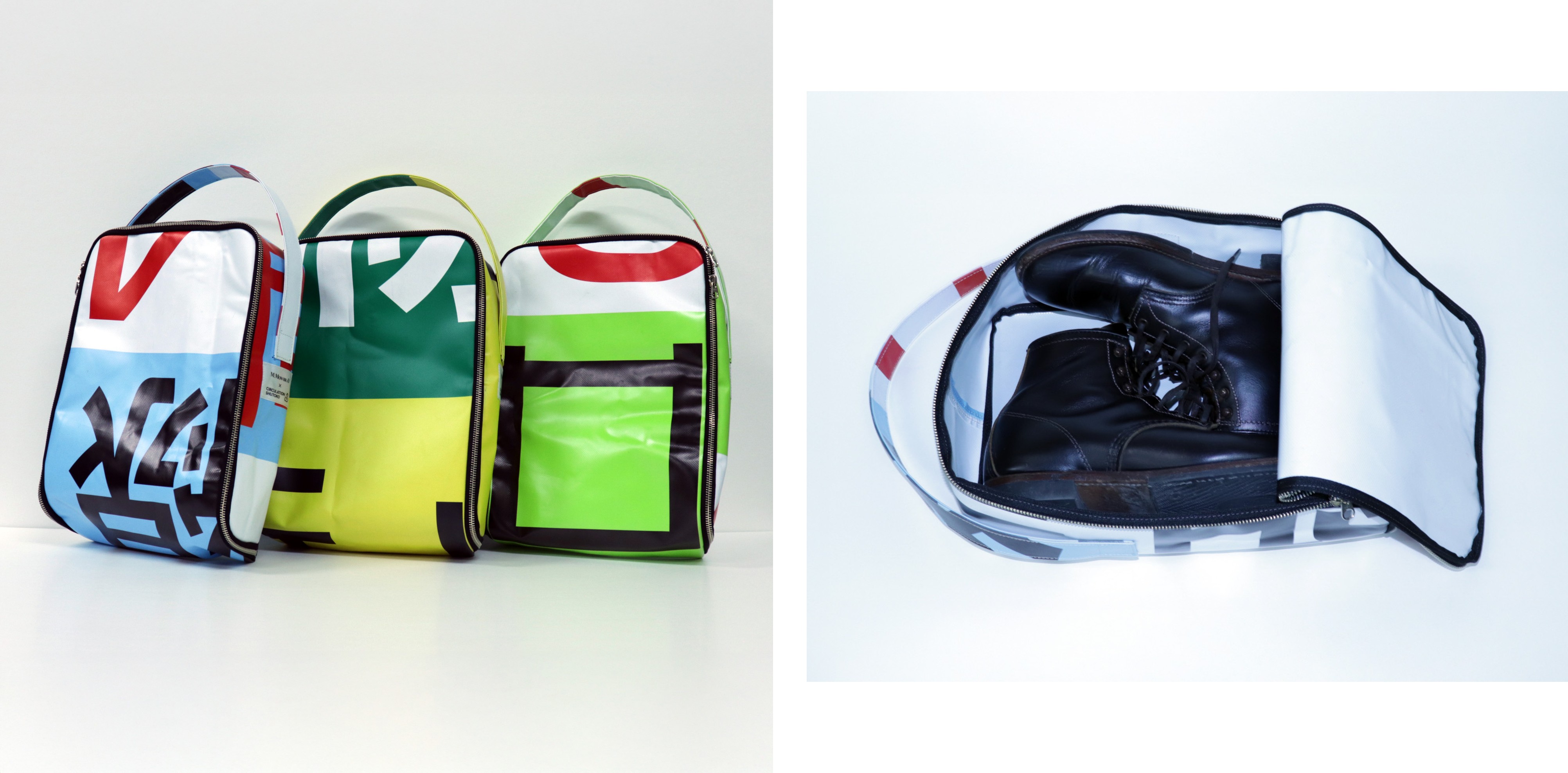 【新製品】UPCYCLE SHOES BAG 販売のお知らせ 平素より首都高みやげをご愛顧いただき、誠にありがとうございます。 新製品 <UPCYCLE SHOES BAG> を発売いたしました! 首都高の横断幕がシューズバッグに大変身! 泥汚れや水濡れが気になる靴の持ち運びにぴったりのシューズバッグです。 「UPCYCLE SHOES BAG」は、シューズケア・フットケアブランド M.MOWBRAYと初めてコラボして製作しました。